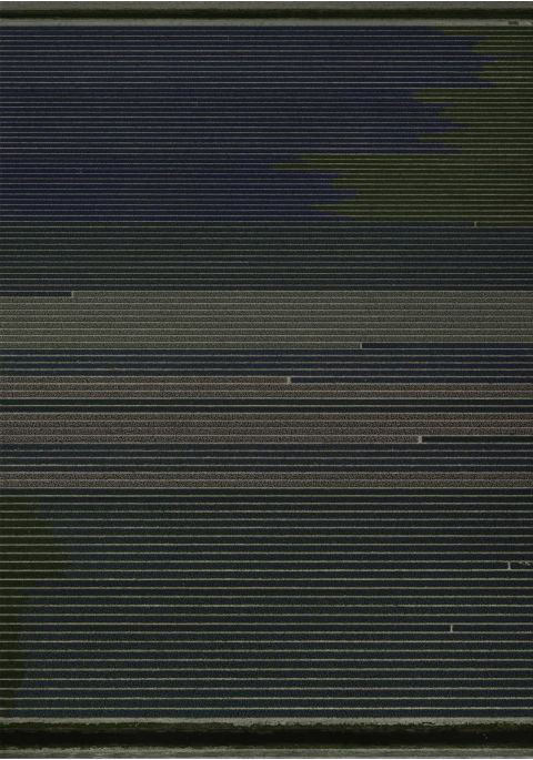 German artist Andreas Gursky is best known for his large-scale digital images. His photographs capture artificial and natural landscapes in modern life, on a grand scale. In his lithographic print Ohne Titel XX, which is derived from his aerial photography of a Dutch Tulip Farm, Gursky investigates how the repetition of thousands of manicured rows of tulips can be transformed into abstract art, namely through their portrayal as graphic pixels on paper. Through the artist’s process, we read this image, initially taken from the natural world, as akin to minimalist stripe paintings. Like his large-scale photographs, this print is about both a real and a constructed world, a representative document of a scene and highly aestheticised.