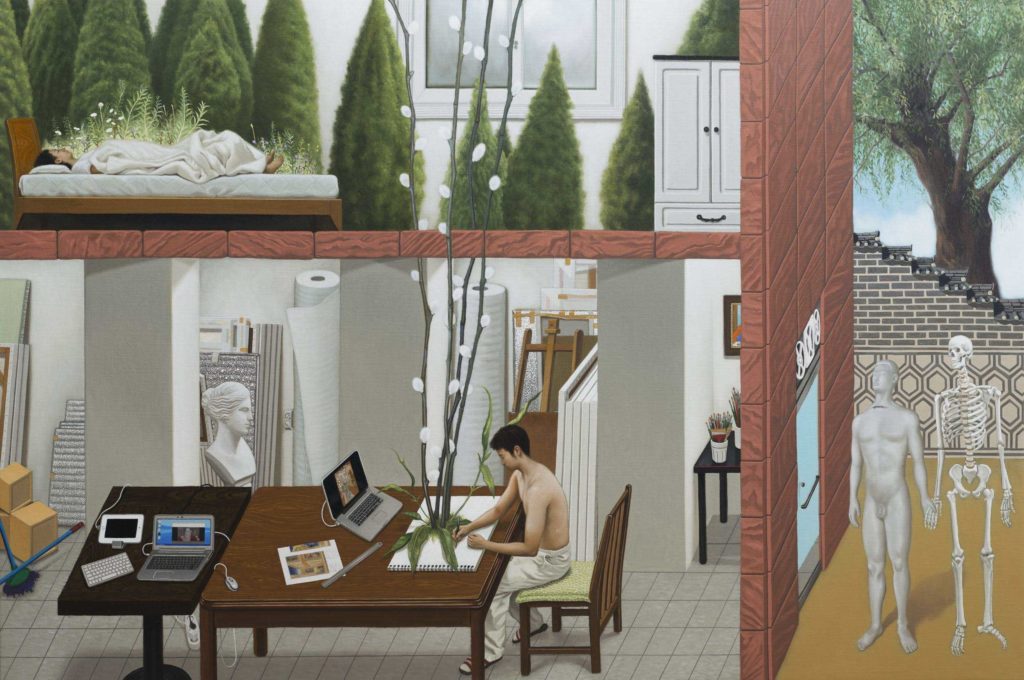 Sung-Kook Kim’s work expresses relationships between individuals, individuals and society, and societies as a whole. Finding these relationships difficult to comprehend, yet ultimately compelling, his works stand as symbolic visualisations of social relationships, feelings, and his internal perspectives of these experiences. They are the process of analysing and understanding the relationships which lie in his surroundings. They are also devices to capture the moments of everyday life which he believes are too meaningful to let pass by. Many of Kim’s themes derive from interpersonal problems; always striving to be an extroverted, sociable person, yet consistently coming up against difficulties. He believes that proper self-disclosure (the extent to which one person reveals himself to another through communication) is necessary for maintaining good relationships with others. In that respect, knowing one's self accurately is important; but for Sung-Kook King this is something he remarks he has still ‘not figured out’. Due to this, he chooses to appropriate well-known images and concepts that exist in society and compose them within his surroundings onto a canvas. For the artist, this is a reflective act and a way for him to see himself, as if looking in a mirror.